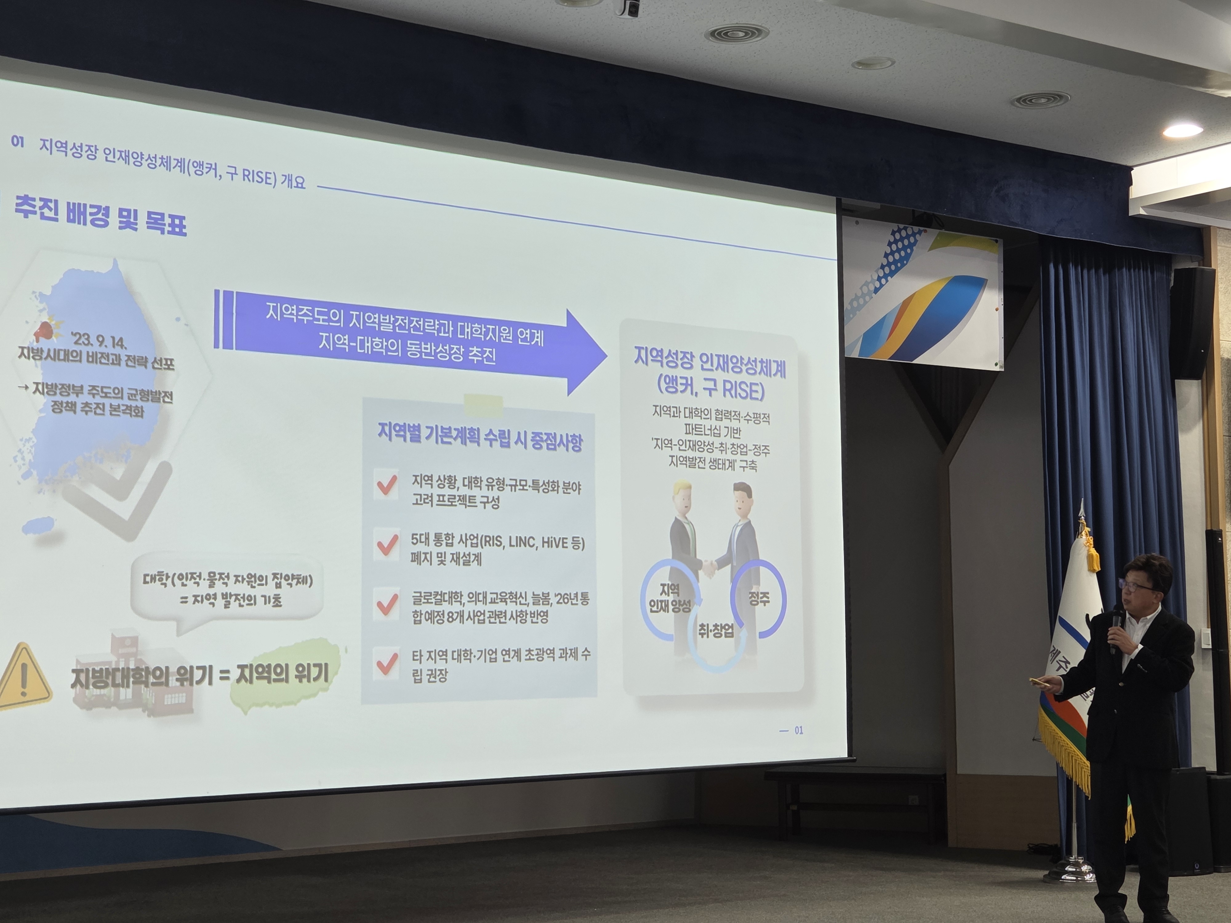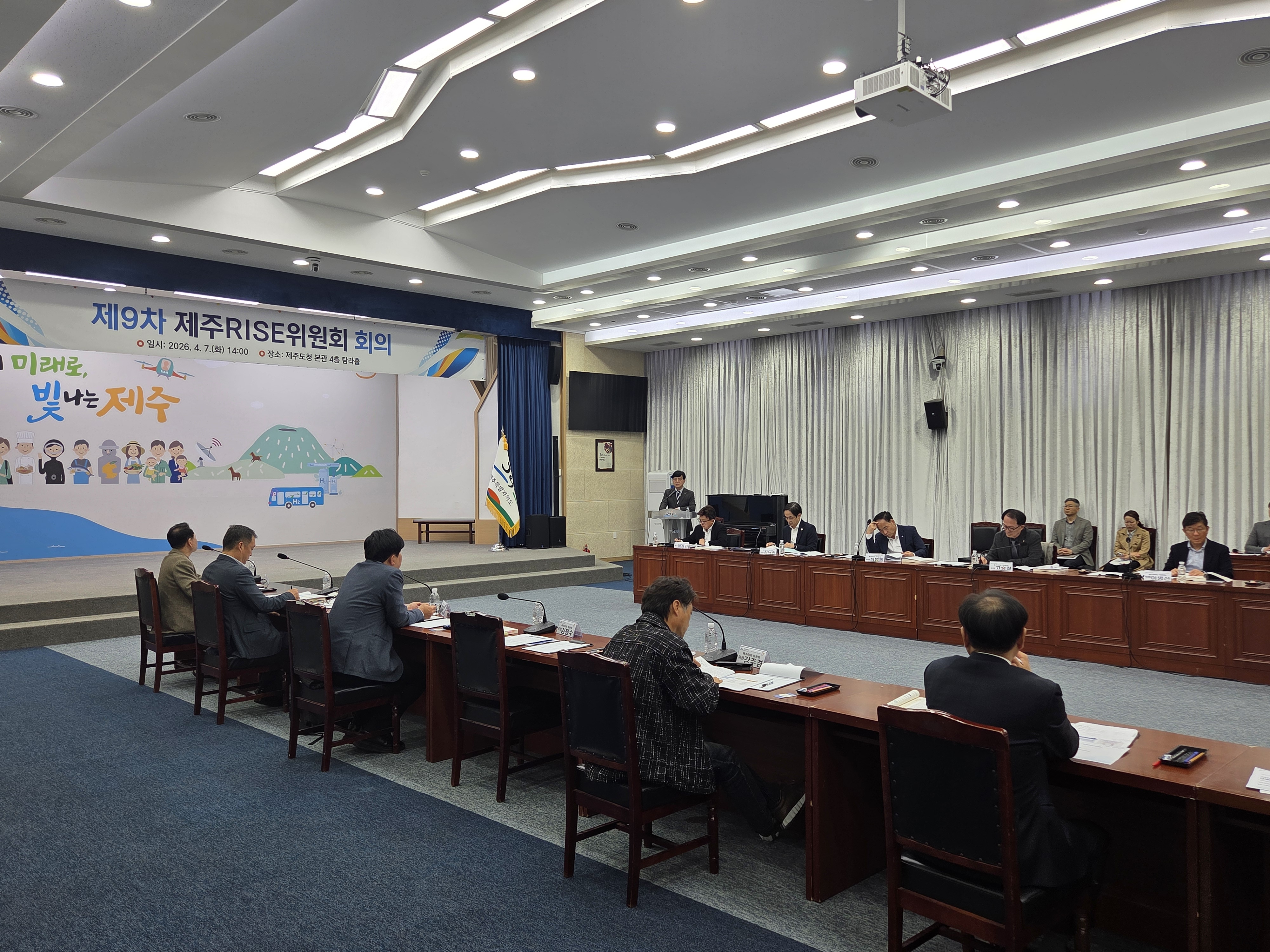 2026년 4월 7일(화), 교육부의 ‘라이즈(RISE)→앵커(ANCHOR)’ 개편 정책을 반영하여 지역 정주형 인재양성 중심의 2차년도 사업 기본계획 재구조화(안)과 시행계획 등을 심의·의결하기 위해 제9차 제주RISE위원회가 제주특별자치도청 탐라홀에서 개최되었다.